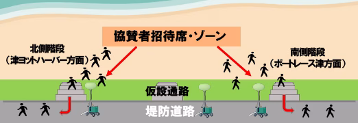 会場案内 阿漕浦・御殿場海岸のどこからでも花火が閲覧可能! 堤防改修工事が完了し、全長約3Kmの海岸すべてで観覧可能に! 当日は、堤防道路を歩行者天国にして来場者に解放します! 協賛いただいた企業・個人全ての方を「協賛者招待席・招待ゾーン」にご招待! 会場の通行について 会場内では歩行者の安全確保のため、次のとおり通行へのご協力をお願いします。 ■ ヨットハーバー駐車場 屋台が多く出店しており大変混雑します。会場内は左回りで移動していただきますようご協力をお願いします。 ■ 協賛者招待席・ゾーン(お帰りの際) 花火大会終了後は、混雑回避のため、係員の誘導に従い堤防前の仮設通路を移動し、ヨットハーバー方面は北側階段をボートレース津方面は南側階段をご利用ください。 ■ 堤防道路 夜間で足元が見えにくくなっています。係員の誘導に従い右側通行で移動していただきますようよろしくお願いします。小さいお子さんをお連れの方は、手をつないで移動するなど、安全面への配慮をお願いします。 注意事項 各自のごみは必ず持ち帰ってください。携帯電話はつながりにくくなりますのでお気を付けください。打上場所及び観覧場所での小型無人航空機(ドローン等)の飛行は禁止です。危険物等の持ち込みは固くお断りします。 よくあるご質問 (1)海の家は営業しているのか?営業されます。(2)屋台は出るのか?また、営業時間は?出店します。主に津ヨットハーバーの駐車場に約110店舗の屋台が並び、花火大会の雰囲気を盛り上げていただく予定です。また、屋台の営業時間は16時ごろから順次営業を開始し、午後9時15分までです。(3)トイレの場所は?常設のトイレとしては、御殿場林跡公衆便所、御殿場緑地内公衆便所、南御殿場公衆便所、御殿場海岸南公衆便所があります。仮設トイレは、津ヨットハーバー入口堤防上に12基、マックスバリュ港町店前に2基、ヨットハーバーと打ち上げ正面の間に5基、協賛者招待席・ゾーン付近に11基、の計30基をご用意しています。